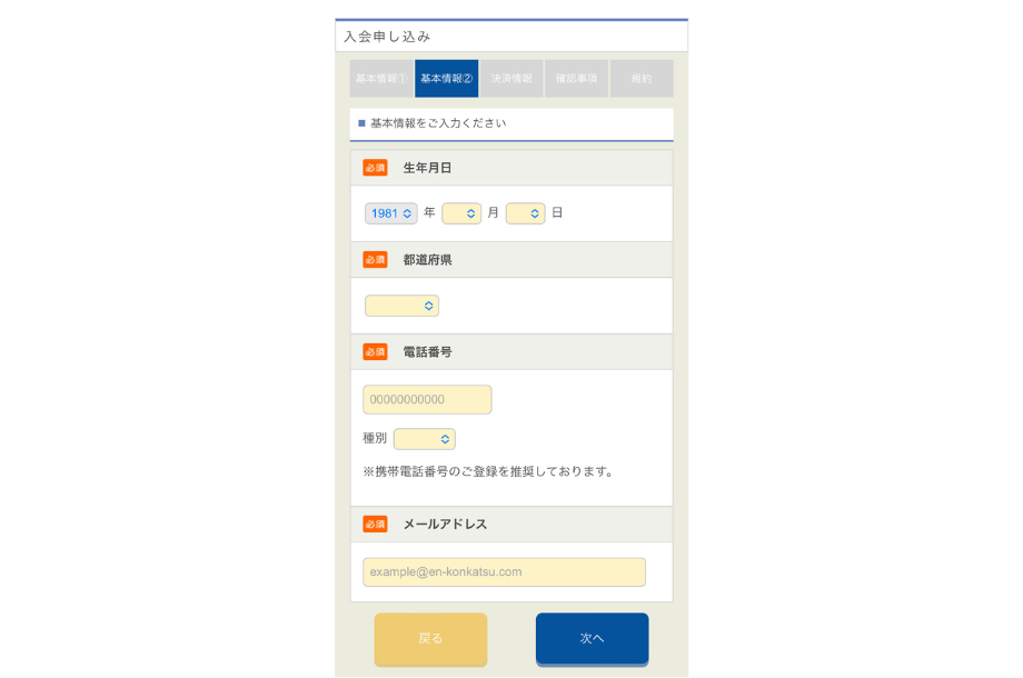 ここでは、「生年月日」「都道府県」「電話番号」「メールアドレス」を入力します。