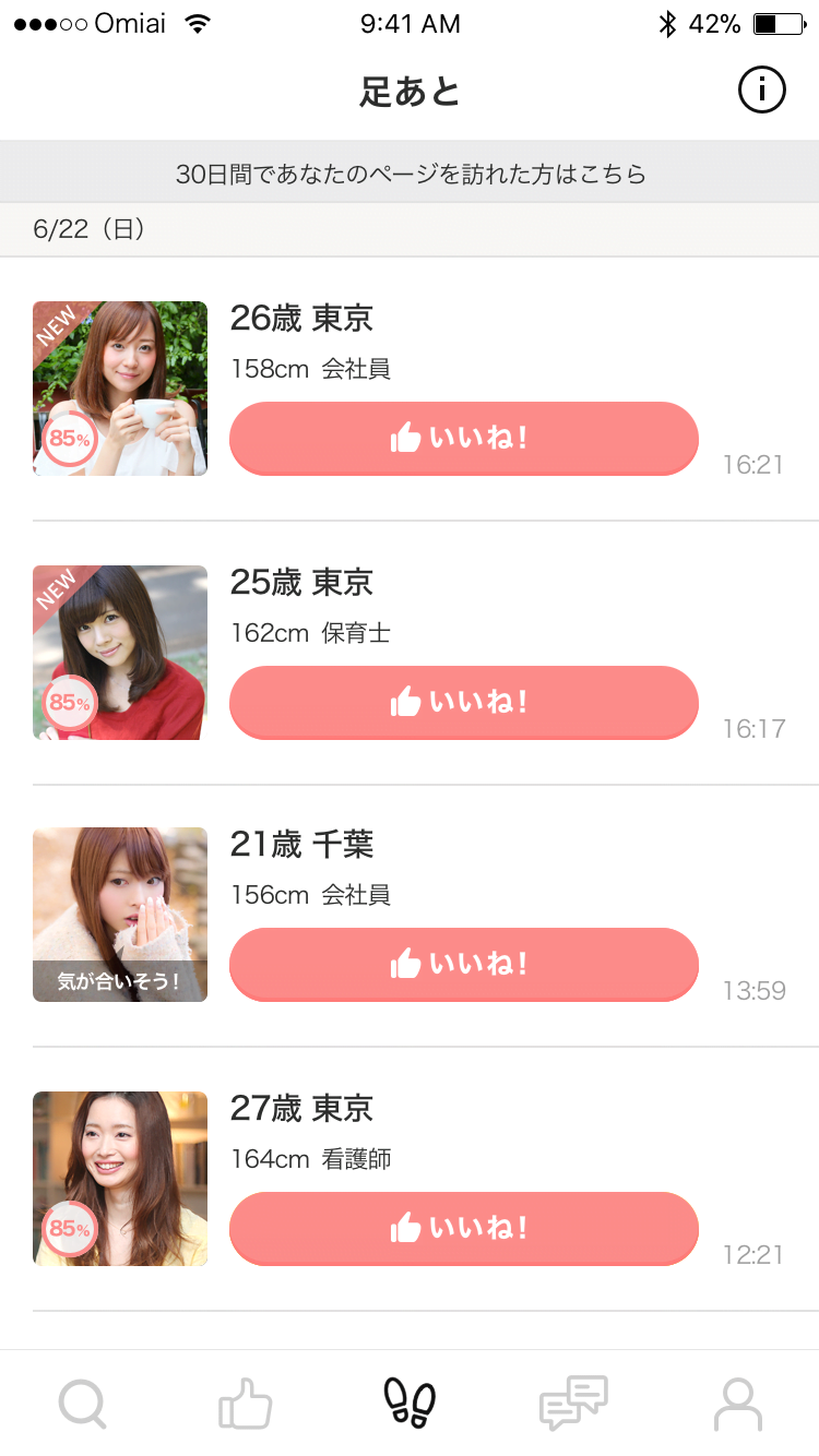 • Omiaiの足跡からマッチングしたい場合は、相手がいいね!を押したくなるようなプロフィールを作成すること。