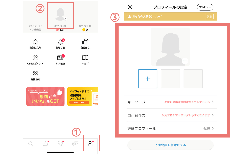 Omiaiには「みてね!」という機能もあり、自分のいいね!を優先的に相手の画面へ表示させることができます。