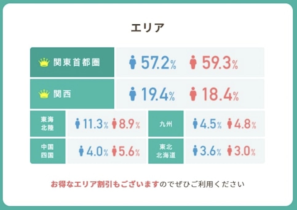 - お相手が少ない地方でも、近県でお相手が多い地域を活動範囲に含めれば利用可能。