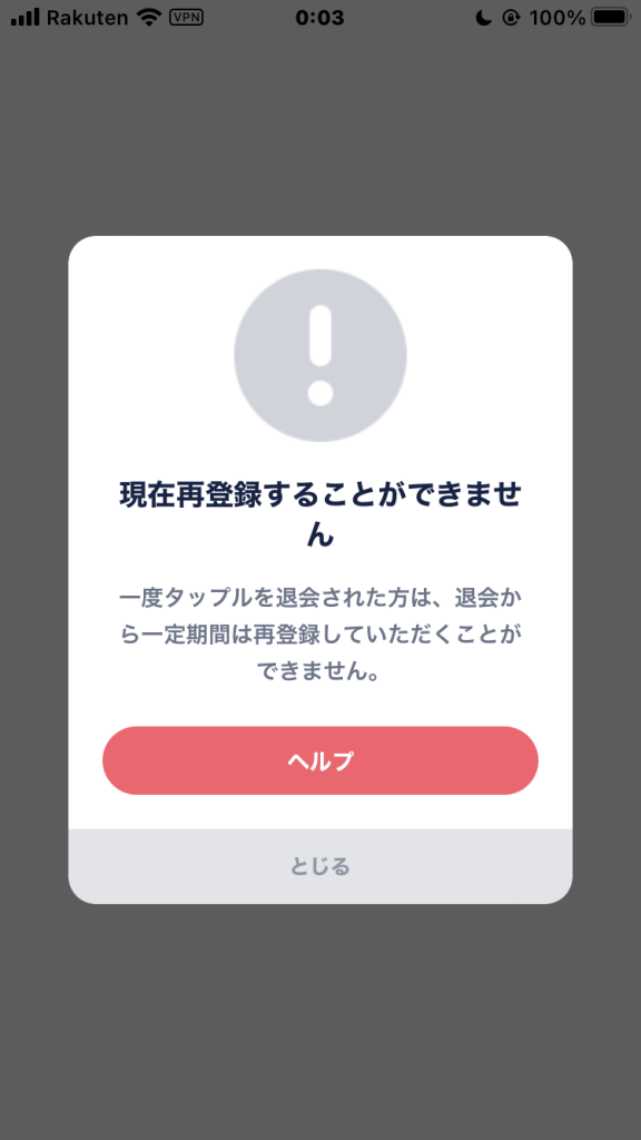 タップル退会後、1週間は再登録が出来ないようになっています。