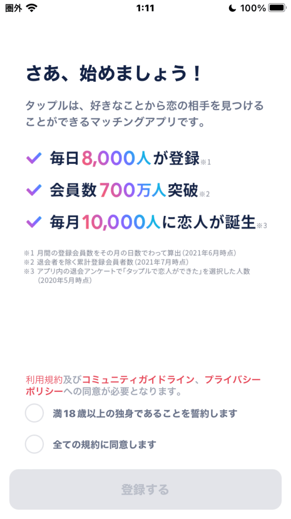 タップルの再登録では、以前の情報は抹消されるので、新規登録と全く同じ手順を踏みます。
