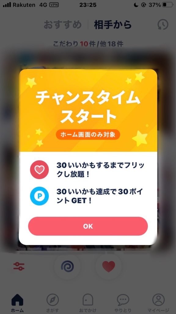 「チャンスタイム」は30いいかもするまでフリックし放題、30いいかも達成すると30ポイントがゲットできます。